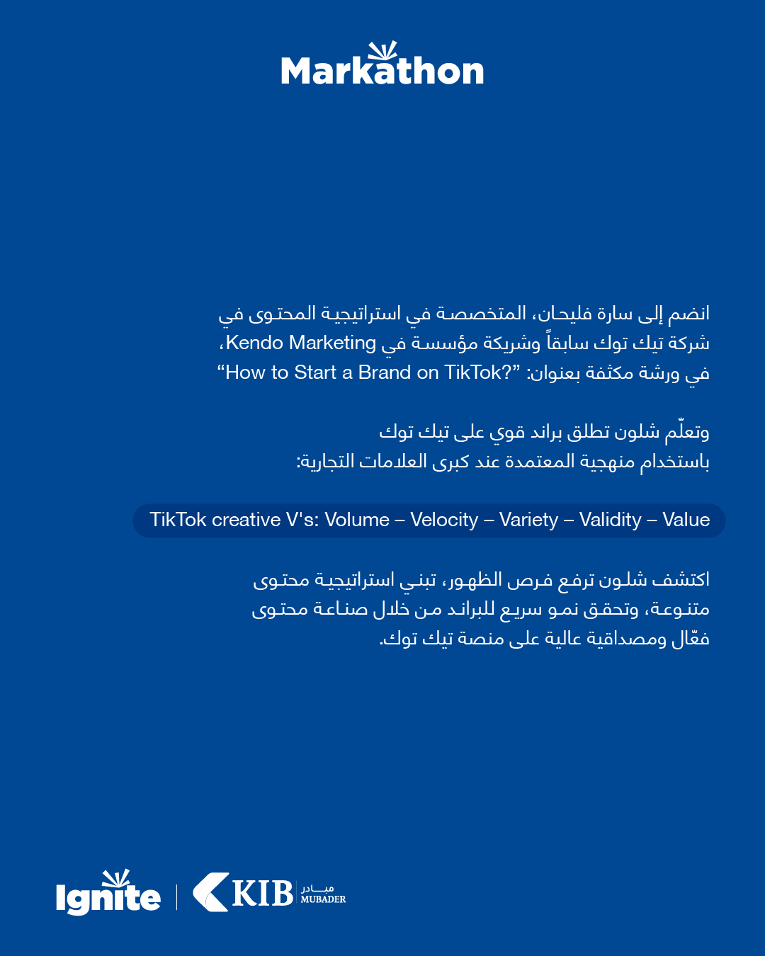 انضم إلى سارة فليحان، المتخصصة في استراتيجية المحتوى في شركة تيك توك سابقاً وشريكة مؤسسة في Kendo Marketing، في ورشة مكثفة بعنوان: